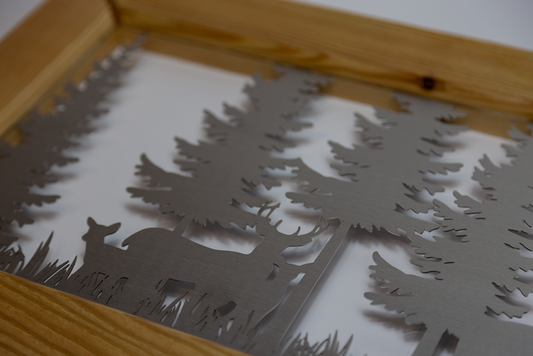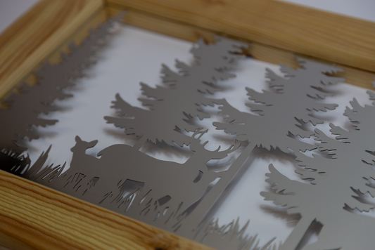 Quadro cervi foresta (Lamiera satinata cornice fiammata)